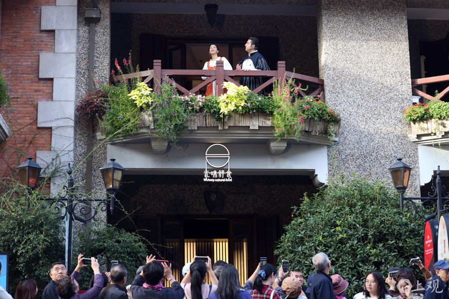 10月25日下午,在思南公馆露天广场上演的法国沉浸式歌剧《罗密欧与朱丽叶》现场人气爆棚。\n这是开场前“从天而降”的经典片段“阳台相会”快闪秀。