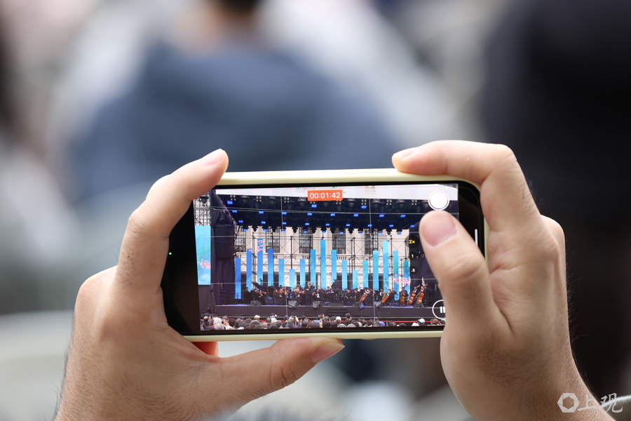 周日上午,悠闲与音乐在上海城市草坪广场邂逅,上千名市民游客早早入场坐好,等候张家界(国际)爱乐乐团的演出《你好,中国》。