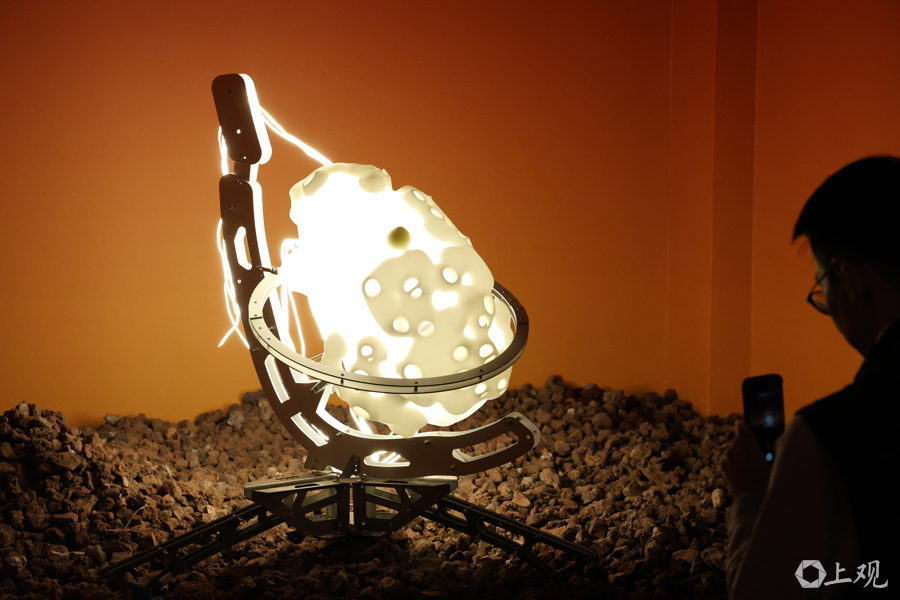 这是名为《天空呼吸的频率》的展览分为三个章节,共展出十余件作品。以“云、碳、光、电”等自然元素为叙事线索。